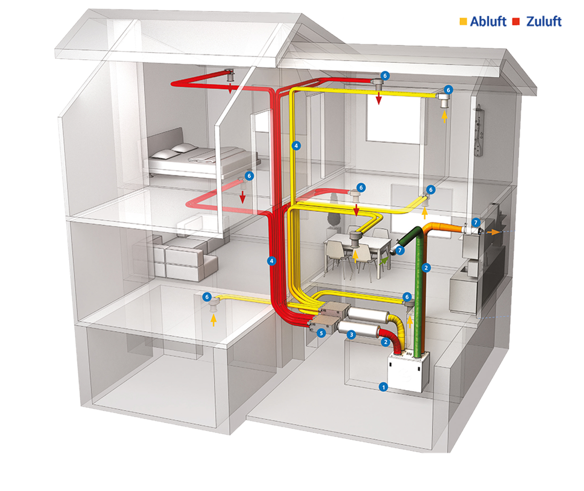Die kontrollierte Wohnraumlüftung führt kontinuierlich frische Luft von außen zu, während verbrauchte und feuchte Luft abgeführt wird. Dieser Austausch erfolgt automatisch und ist so konzipiert, dass er den individuellen Bedürfnissen Ihres Haushalts entspricht. Durch die stetige Erneuerung der Raumluft wird die Konzentration von CO2, Schadstoffen und Allergenen signifikant reduziert, was zu einem gesünderen Wohnumfeld führt.